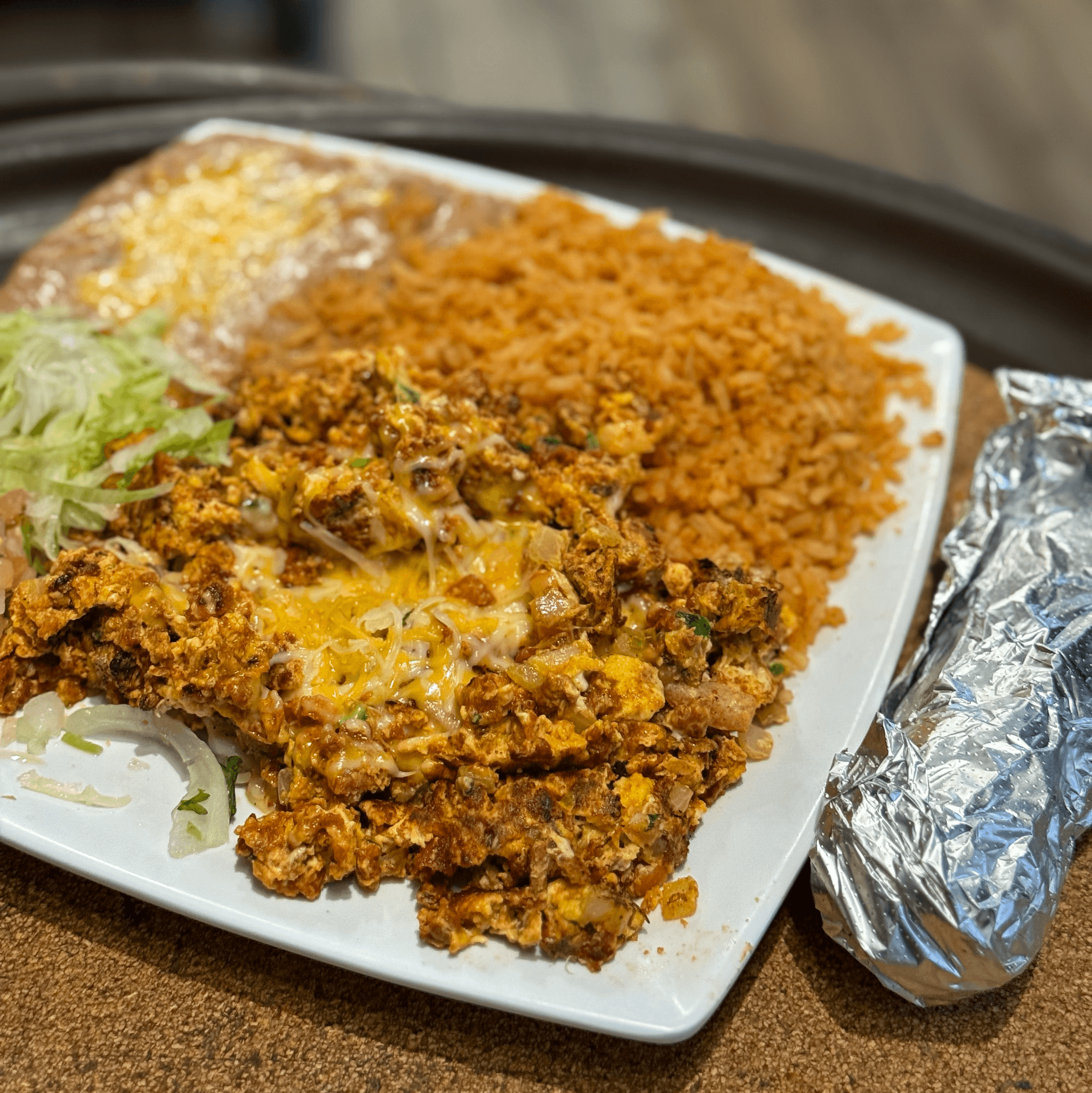 Our juicy and delicious shredded beef is scrambled with eggs. This combo is great as a breakfast or dinner. Pick your choice of a flour or corn tortillas