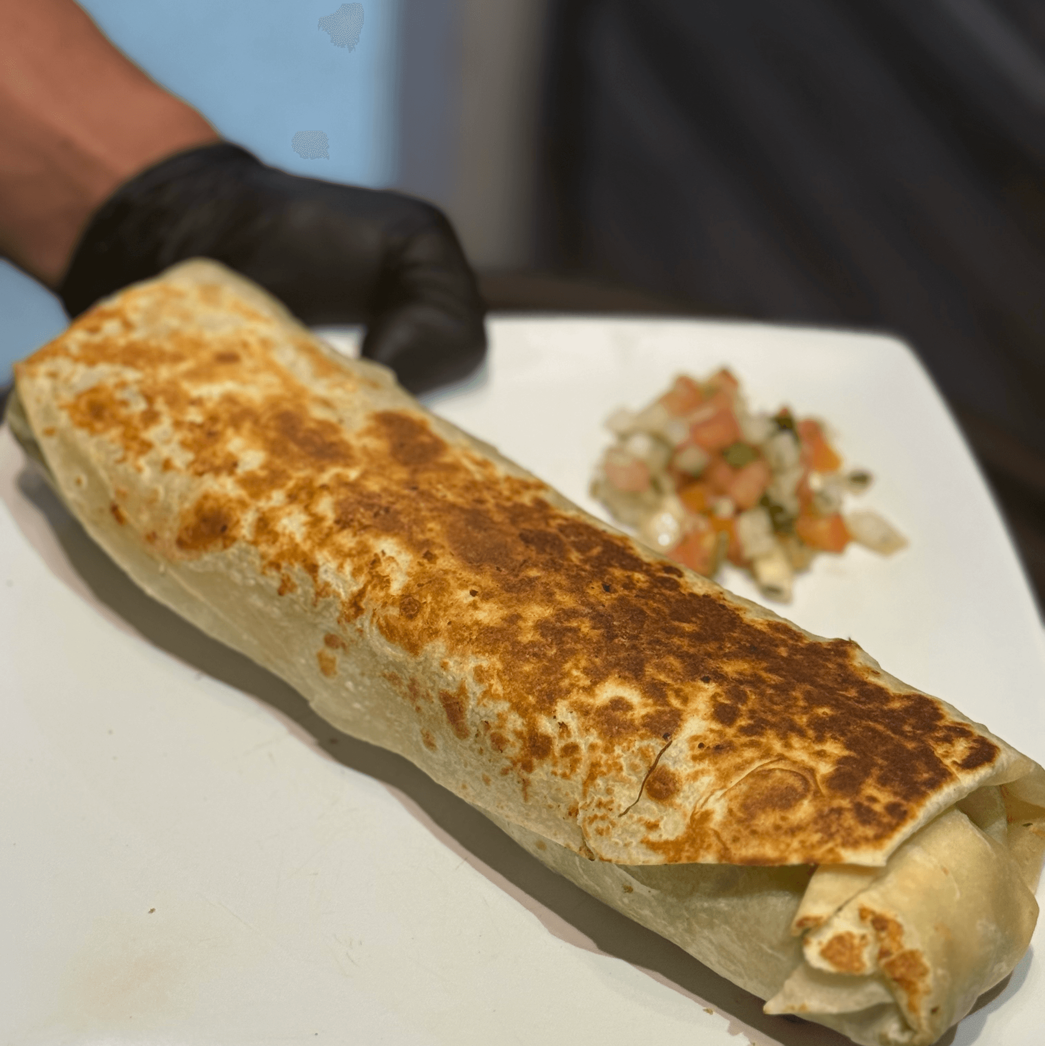 You get your choice of meat wrapped in our homemade 14 in. Flour tortilla stuffed with rice, beans, and cheese and deep fried in vegetable oil for a crispy shell. It is then topped with guacamole, sour cream and cheese with A Little Bit of lettuce and pico de gallo on the side