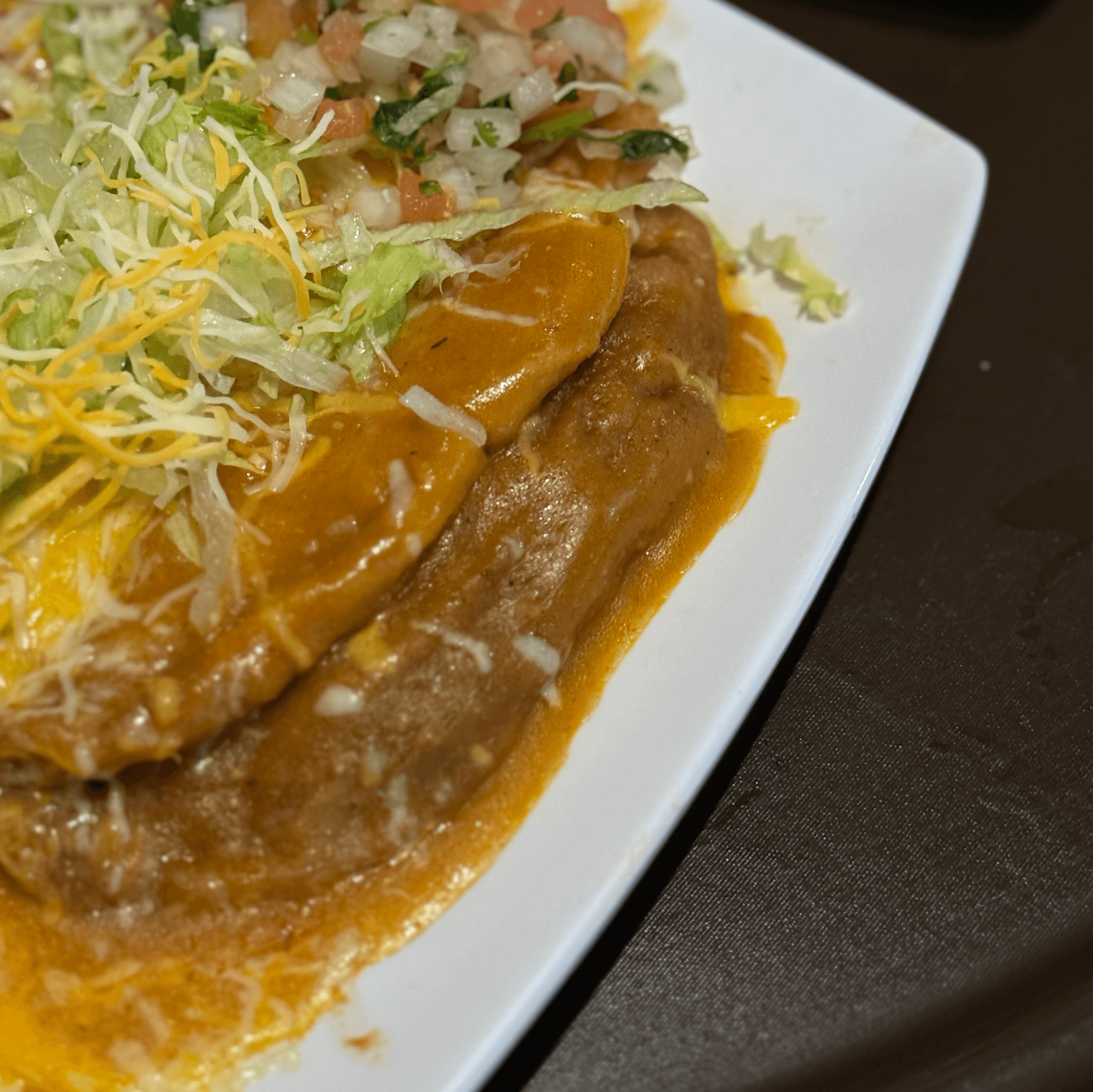 A corn tortilla stuffed with cheese and smothered in our famous enchilada sauce and topped with lettuce and cheese