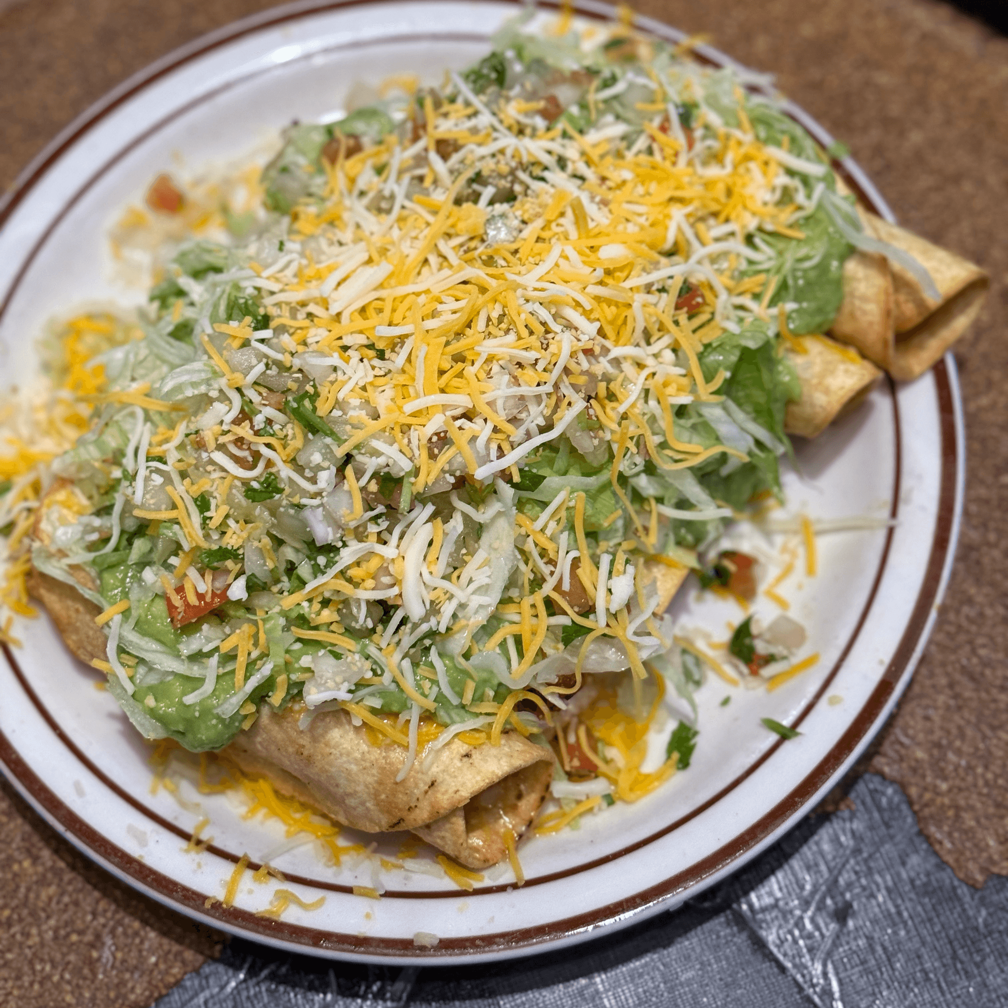 Shredded beef wrapped in corn tortilla and deep fried. It’s topped with guacamole, lettuce, Monterey Jack cheese and pico de gallo (onions, tomatoes and cilantro)