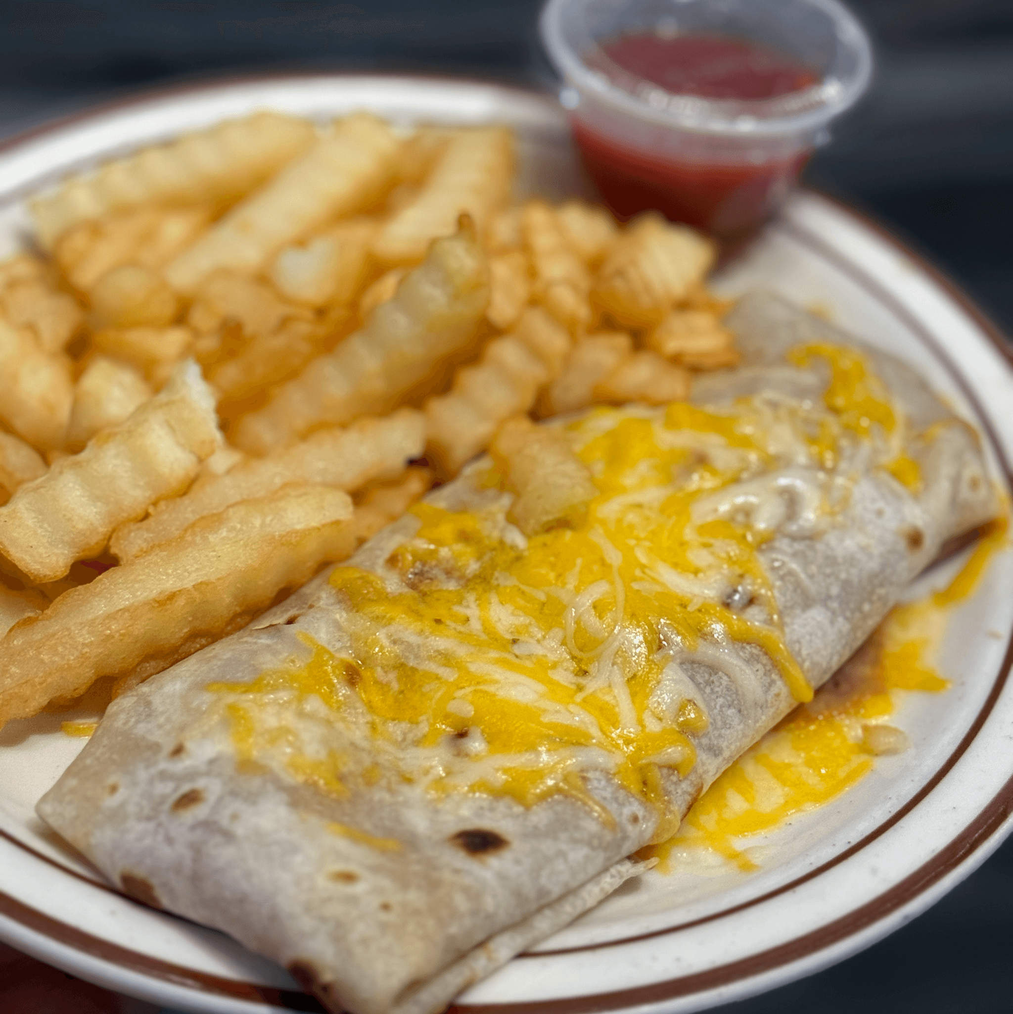 For our little friend we have a shredded beef, rice and bean burrito, wrapped in a flour tortilla, smothered with our delicious enchilada sauce topped of with cheese